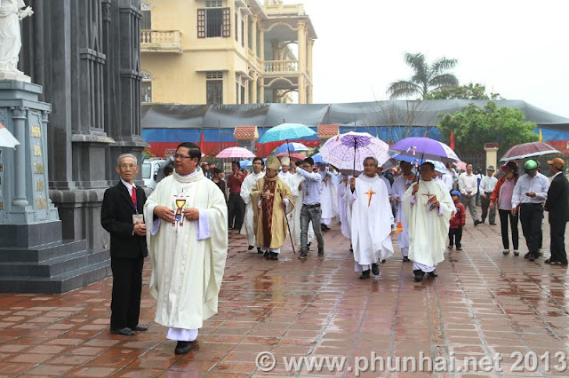 Thật đặc biệt trong thánh lễ hôm nay, khi giáo xứ đền thánh lần đầu tiên vinh dự tổ chức thánh lễ long trọng này. Ngay từ sáng sớm giáo dân trong giáo phận nô nức kéo về đền thánh, cùng với vị chủ chăn của mình dâng thánh lễ rất sốt sáng. Tuy trời mưa nhỏ nhưng không ngancanr được những bước chân từ khắp các nẻo được. Mọi con đường dẫn về đền thánh vui như trẩy hội đền thờ.